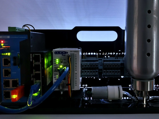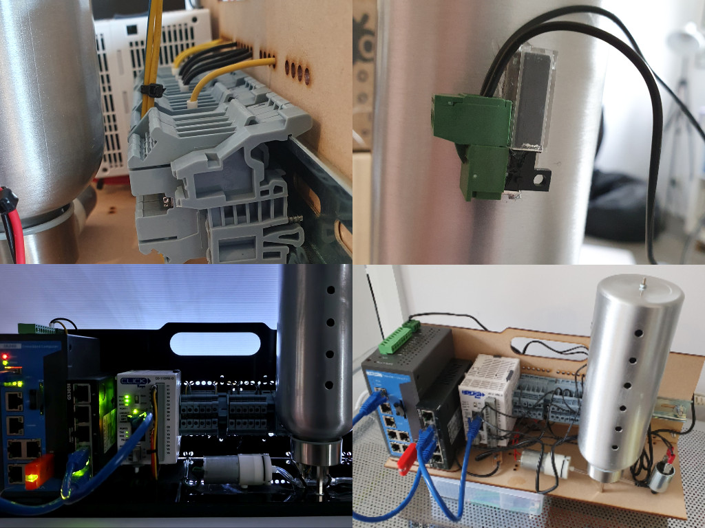 A cyclic factory automation, operated by a PLC and other supporting systems and hardware. The automation continuously inflates and drains a blue balloon within the tank, simulating a rising and falling liquid level. Successful compromise of the environment (overfilling the tank) causes the balloon to pop, signalling success.