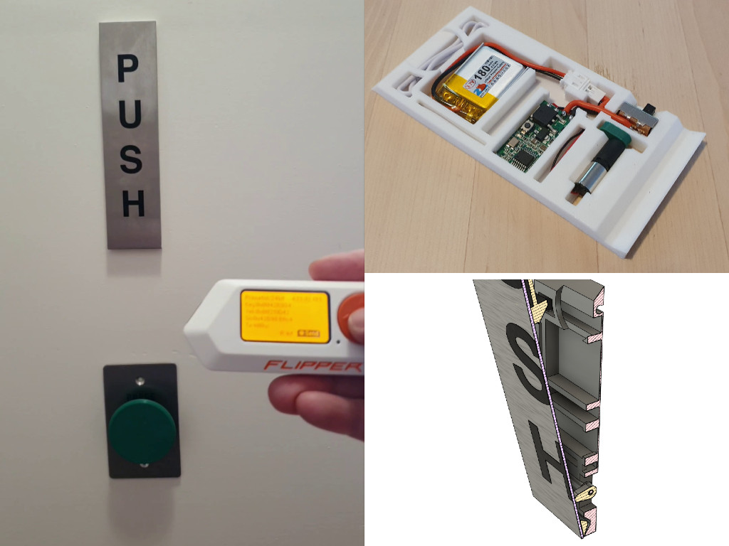 Hidden within a Push sign is a remote-controlled actuator to trigger request to exit buttons, for physical security penetration testing/red teaming. The idea is you install it when visit the target during normal hours, as a tour, or under the guise of a facilities employee/contractor, then return at night to trigger it to open a door from the inside.
